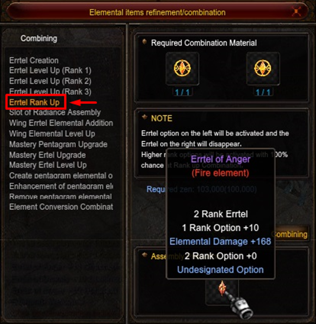 <mark style="color:red;">**IMPORTANTE:**</mark> Al usar **2 Errteis Rango 1+7**, es importante recordar que el primer Errtel será el item que elijas evolucionar, es decir, el segundo Errtel solo se usará para crear el Rank 2.