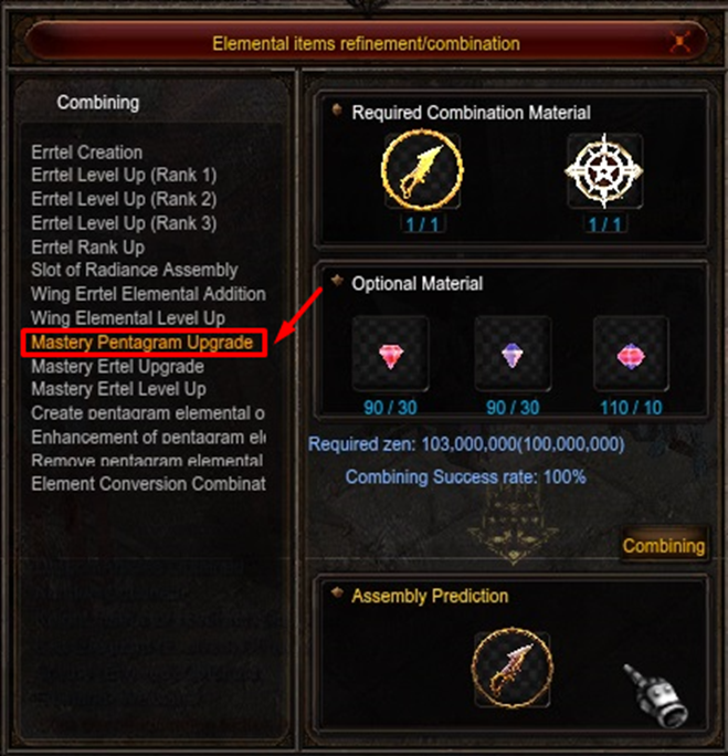 Creado para *evolucionar* el **Pentagram Común**, el **Mastery Pentagram** mantiene la misma dinámica en cuanto a daño y defensas elementales. Terminó surgiendo una nueva combinación llamada opciones antiguas, formando una combinación perfecta de Set Option. Para crear un Pentagrama de Maestría.\