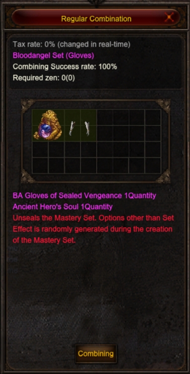 How to unlock the Blood Angel set? To unlock the Blood Angel set, the player will use a sealed part of the set and an Ancient Hero Soul in the Chaos Machine in Regular Combination simply place the AHS and the part of the sealed set they want to unlock into the machine, then simply click combine and removes his Chaos Machina item. This combination has a 100% chance of success.