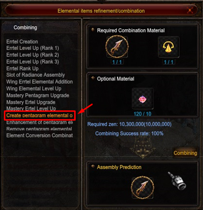 Clicking on NPC Adniel will bring up the Create Pentagram Elemental Option function. To create an elementary option you will need: