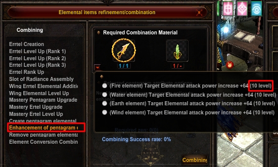 Clicking on NPC Adniel will bring up the Enhancement of Pentagram Elemental Option feature. To evolve the Elemental Option you will need: