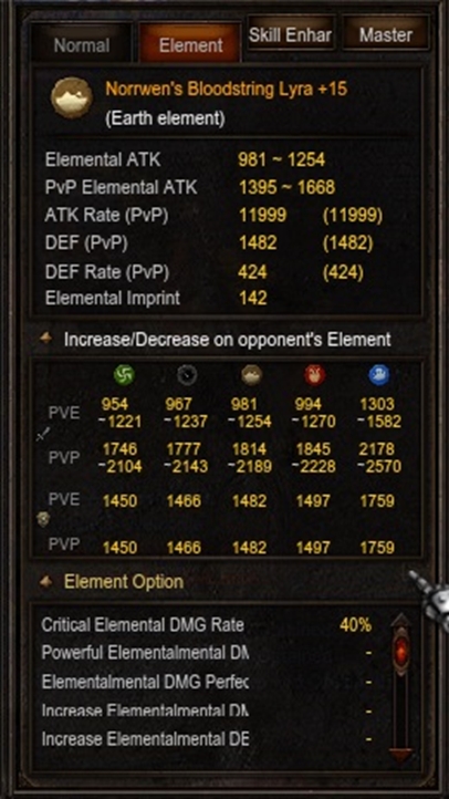 Finally, by pressing the C key, on the side of the “Stats” window is the “Elementary” tab. Below, on the sword (attack) icon, will be the amount of damage you will do to your opponent/mob in PVM and PVP. And on the shield (defense) icon, how much you will reduce your opponent/mob's PVM and PVP defense.