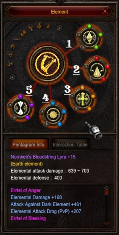 The pentagram can be upgraded like a normal item, evolving up to +6 with Jewel of Bless and up to +9 with Jewel of Soul, from which it is enough to evolve in the Chaos Machine located in Noria. To open the staff information window, simply right-click on it while holding down the ALT key. The slots of the staff go according to the following Errtels