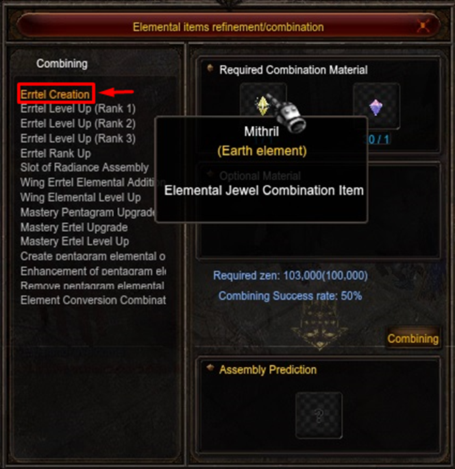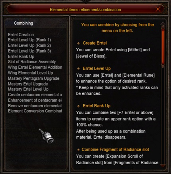 By clicking on the Errtel Creation option, you will need 1 Mithril of the item you want to create the Errtel (matching 5 Mithril Fragment will automatically transform it into Mithril) and 1 Jewel of Bless. It is worth remembering that the Mithril Fragment drop can be dropped in Acheron.