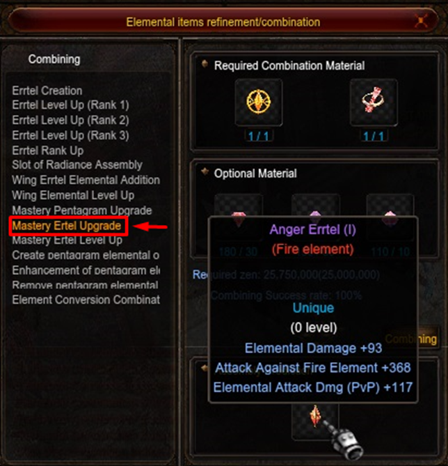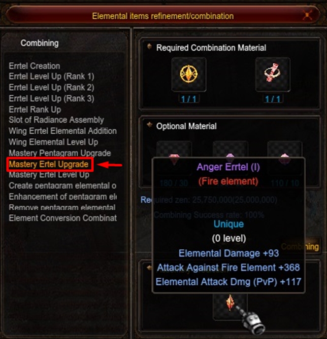 Clicking on NPC Adniel will bring up the Mastery Errtel Upgrade feature. To create the Errtel update you will need: