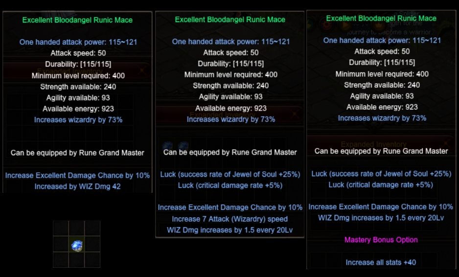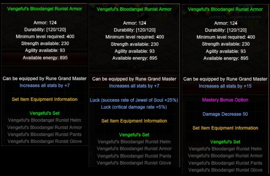 ATTENTION WHEN USING MYSTERIOUS STONE ON ANY PART OF THE SET/WEAPON, YOU MAY REMOVE THE ADDITIONAL LUCK OPTION OR EVEN NOT CHANGE THE OPTIONS.